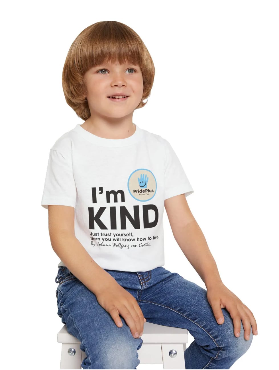 慈善活動団体プライド・プラスが贈る、特別なメッセージが込められた子ども用アファメーションTシャツです。