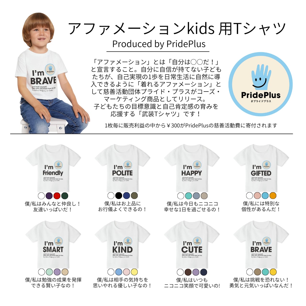 慈善活動団体プライド・プラスが贈る、特別なメッセージが込められた子ども用アファメーションTシャツです。