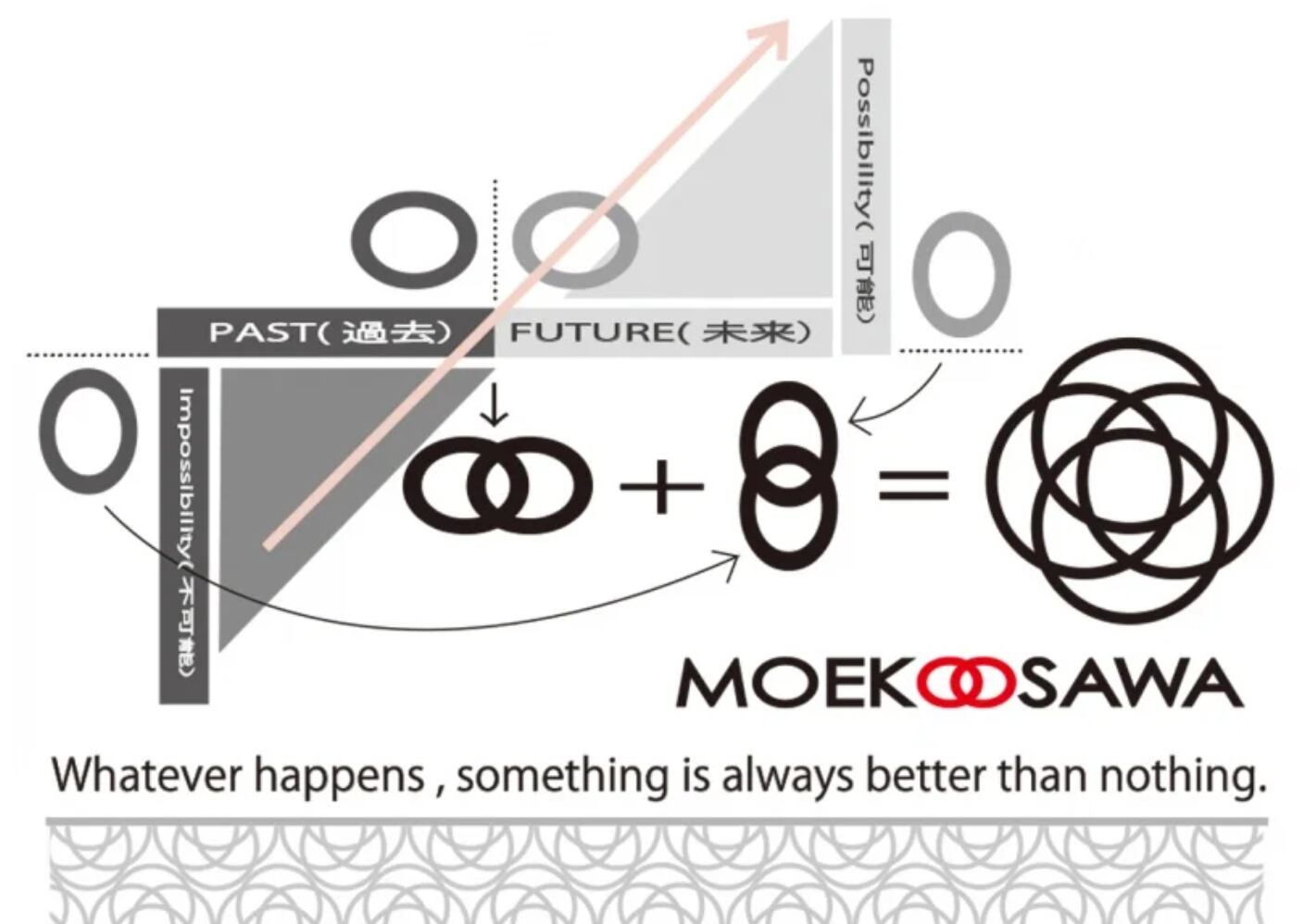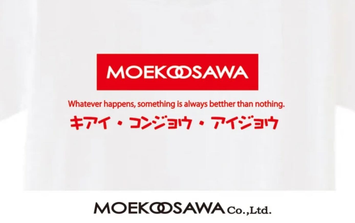 「過去x未来」+「不可能x可能」の融合イメージでデザインされた、MOEKOOSAWAロゴをメインに、社是の「Whatever happens, something is always better than nothing.(何が起きても、経験しないよりマシ!)(無駄な経験なんて、何一つない!)と、チーム・ハイミの合言葉(?)な、「気合・根性・情熱(愛情)」を、海外ツアーらしく(?)カタカナで表記した、moetらしい遊び心満載の、「暑苦しさ全開w」のオリジナル限定デザイン。