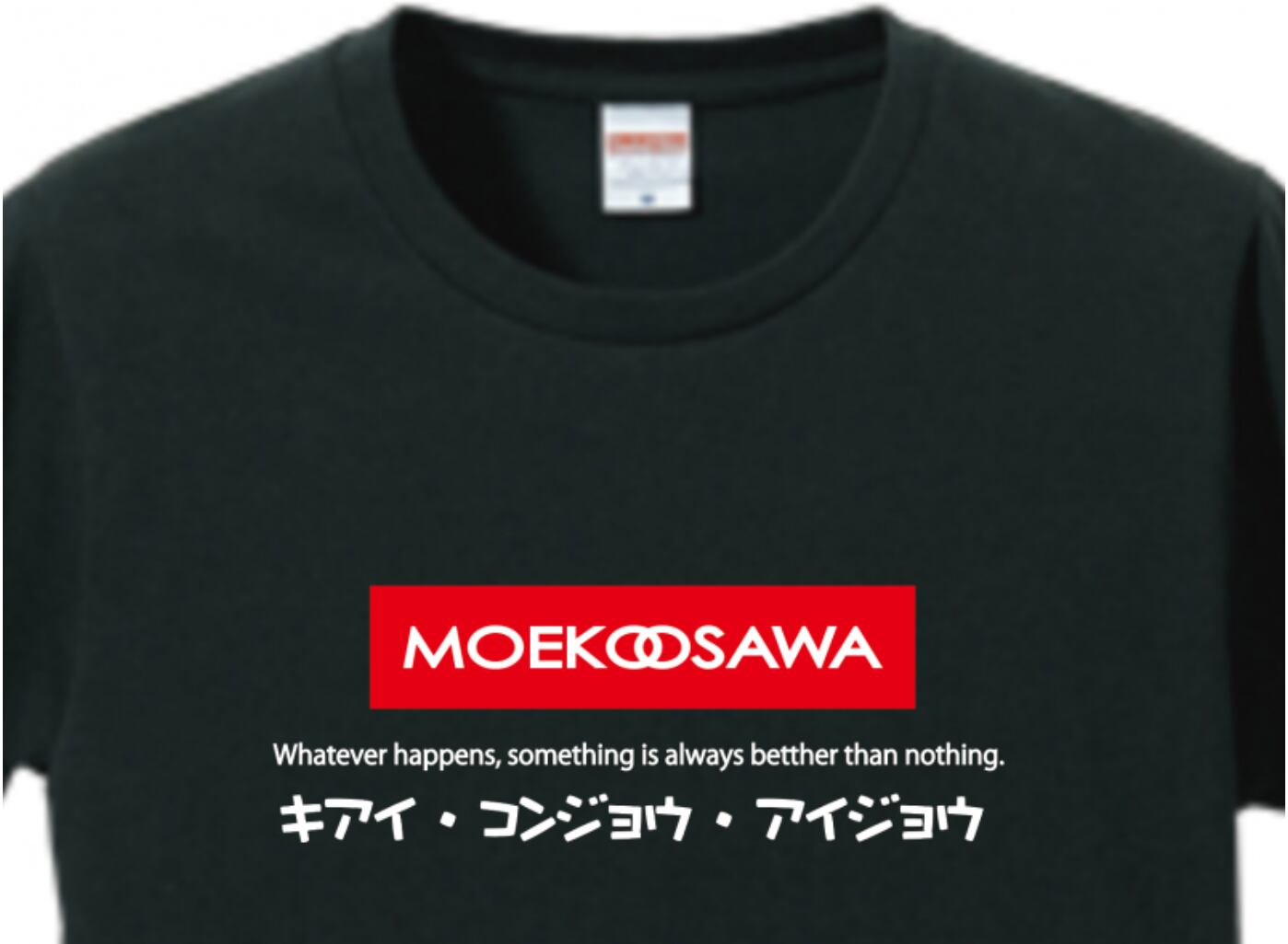 「過去x未来」+「不可能x可能」の融合イメージでデザインされた、MOEKOOSAWAロゴをメインに、社是の「Whatever happens, something is always better than nothing.(何が起きても、経験しないよりマシ!)(無駄な経験なんて、何一つない!)と、チーム・ハイミの合言葉(?)な、「気合・根性・情熱(愛情)」を、海外ツアーらしく(?)カタカナで表記した、moetらしい遊び心満載の、「暑苦しさ全開w」のオリジナル限定デザイン。